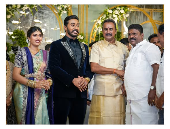 Under the leadership of Honourable Former Chief Minister and General Secretary of AIADMK, Leader of the Opposition, Thiru Edappadi K. Palaniswami, and in the presence of Honourable Former Minister, Head Office Secretary of AIADMK, Coimbatore Suburban South District Secretary, Leader of the Opposition Chief Whip, and Thondamuthur Legislative Assembly Member, Thiru S. P. Velumani, along with Honourable Former Minister for Health and Family Welfare, Dr. C. Vijayabaskar, Dr. Ln. R. V. Palanivel, Secretary, AIADMK MGR Youth Wing, Pudukkottai North District, personally visited the family function held at the residence of Thiru S. P. Velumani and extended his warm congratulations and best wishes to the newlyweds.