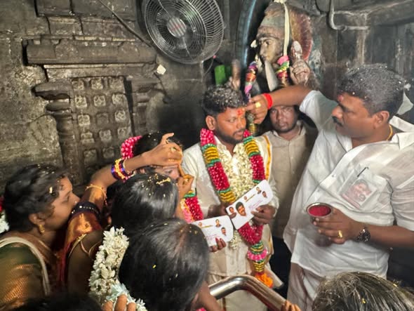 Dr. Ln. R. V. Palanivel, B.Sc., Secretary, AIADMK MGR Youth Wing, Pudukkottai North District, participated in the wedding ceremony of Dharmalingam and Vijayarani at Kadukkakadu, Karambakudi Union, Pudukkottai District.He performed the Mangalyam (sacred thread tying) ritual and extended his heartfelt wishes to the newlyweds for a happy and prosperous life.