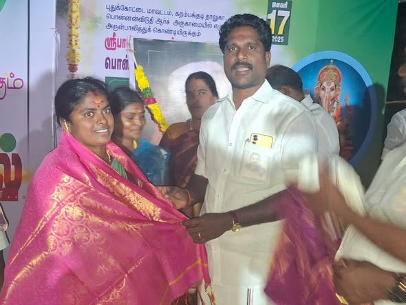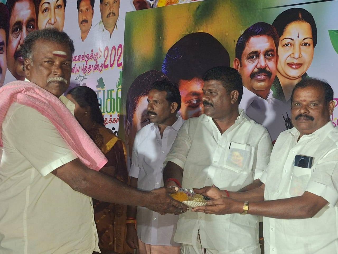 On the occasion of the 108th birth anniversary of the founder of AIADMK, former Chief Minister of Tamil Nadu, Bharat Ratna Puratchi Thalaivar Dr. M.G. Ramachandran, floral tributes were paid to his portrait, remembering his sacrifices and everlasting legacy. Under the guidance of former Honorable Minister for Public Welfare Dr. C. Vijayabaskar, and in the presence of Pudukkottai Karambakudi AIADMK Union Secretaries (South and West), Arusuvai Annadhanam was served to the general public. Branch secretaries were also honoured by presenting veshtis as a mark of respect.