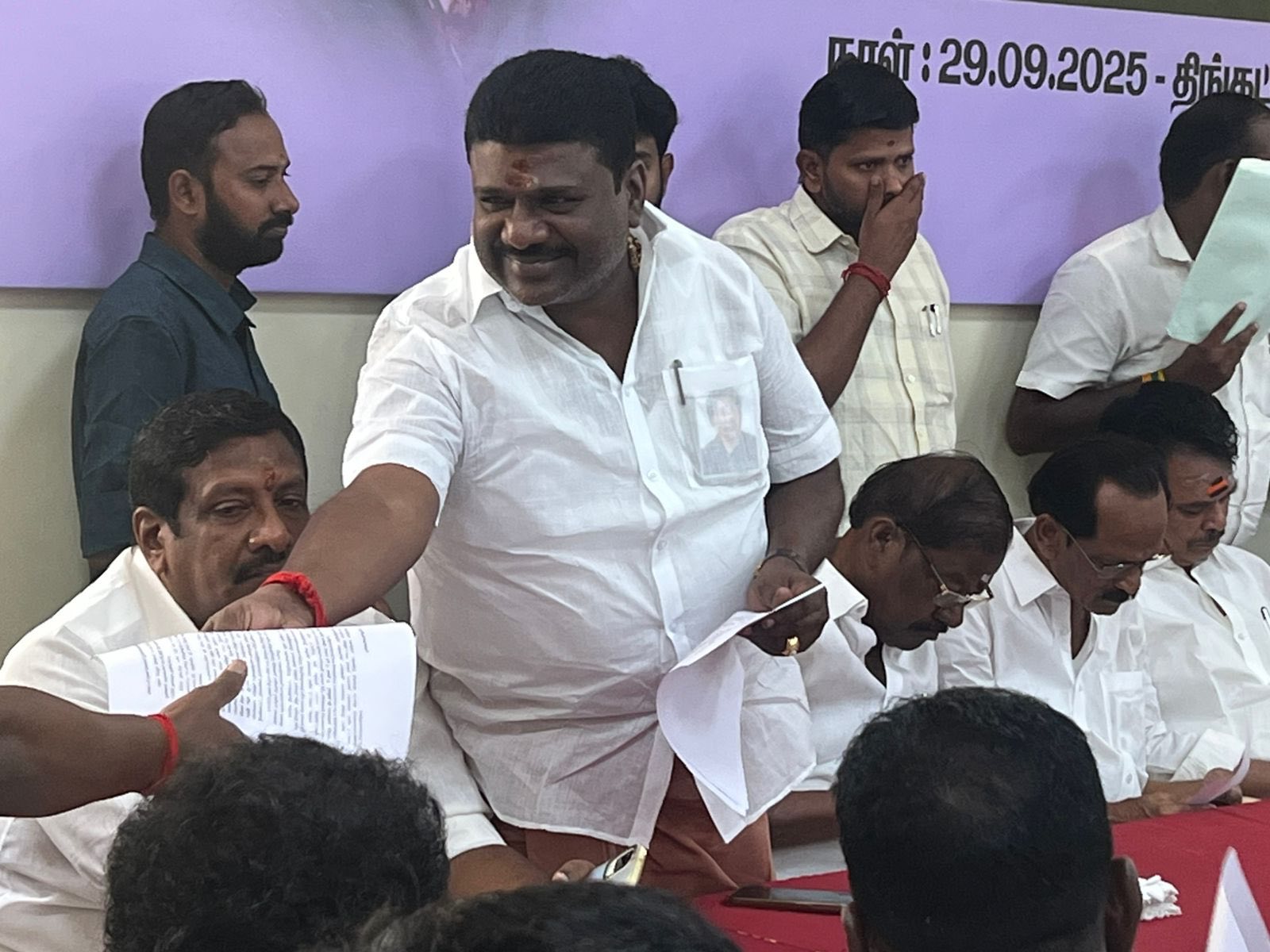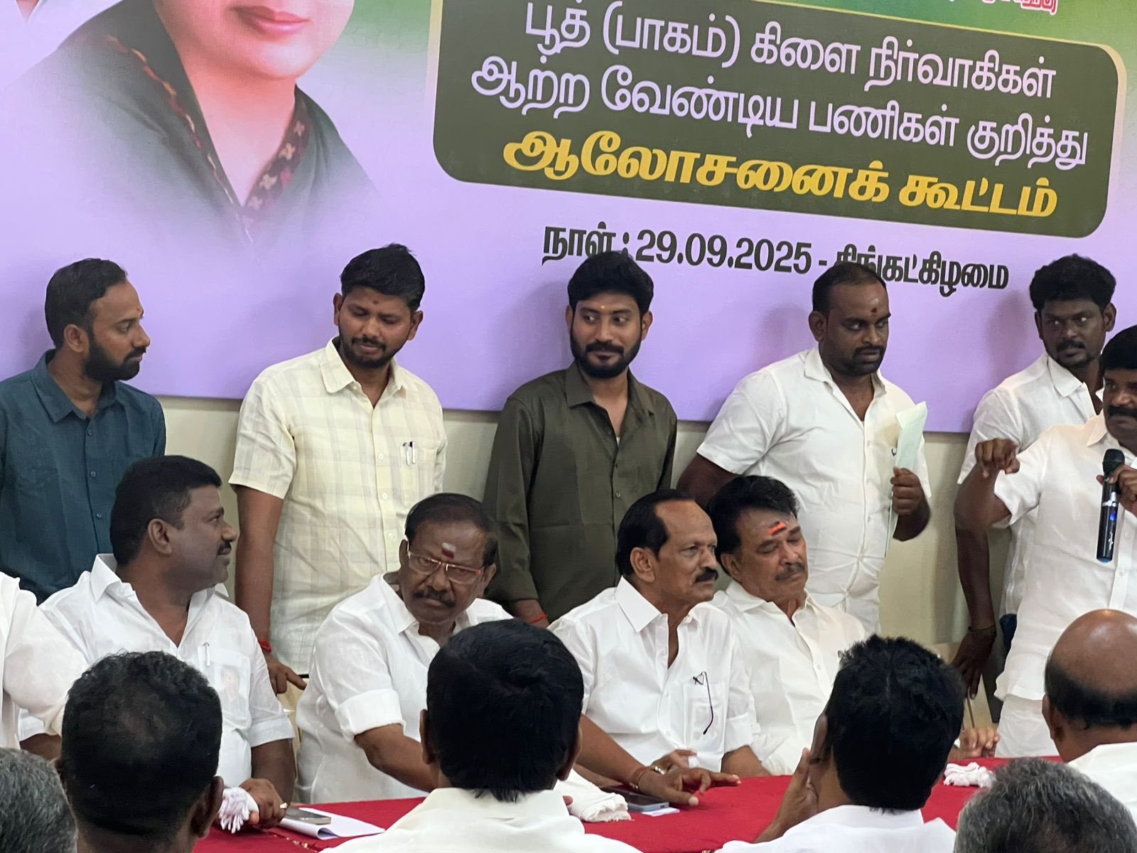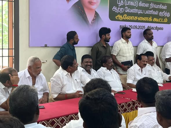 On this day (29.09.2025), the AIADMK North and South Booth Committee Review Meeting was held in Pudukkottai District. The meeting was attended by former Minister Dr. C. Vijayabaskar along with party functionaries. Dr. R.V. Palanivelu, B.Sc., Secretary of the AIADMK MGR Youth Wing, Pudukkottai North District, Chairman of Naga Group, and Owner of Vijay Theatre, participated in the meeting