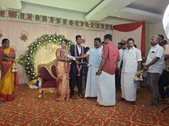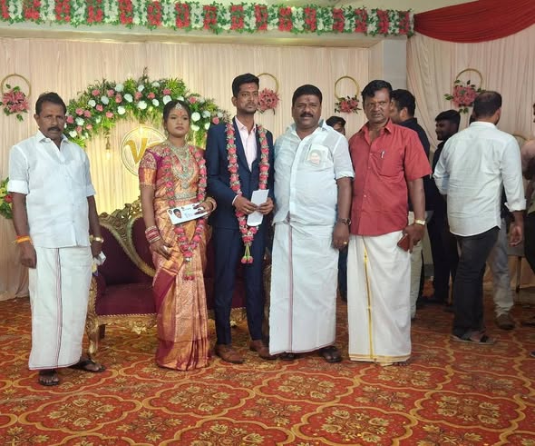 On 21 November 2024, an engagement ceremony was held at Singapore TVS Mahal, Pudukkottai. The occasion was marked by warm wishes and blessings extended to the couple on their special day. Dr. Ln. R. V. Palanivelu, B.Sc., District Secretary, Pudukkottai North District MGR Youth Wing, participated in the ceremony and conveyed his heartfelt congratulations, making the moment a joyful and memorable one.