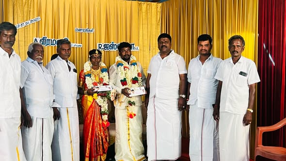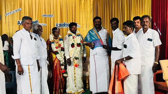 On 07-04-2025, Dr. Ln. R. V. Palanivel, B.Sc., Secretary, AIADMK MGR Youth Wing, Pudukkottai District, attended the wedding ceremony at the residence of Mr. C. Ramachandran, B.A., Postal Department employee, at Meenampatti, Karambakkudi Taluk, and conveyed his heartfelt wishes and blessings to the family on the auspicious occasion.
